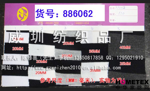 織物組織:色織 幅寬:170 密度:240T 貨號:886062 具體用途:襯衫、休閑服、褲裝、內衣、睡衣、時(shí)裝 成分及含量:滌棉 主要用途:服裝用布 紗支:32 ============================================================= 以上產(chǎn)品全部現貨供應,可隨時(shí)提供樣布卡和現貨,隨時(shí)發(fā)貨。所有產(chǎn)品全部是廠(chǎng)家直銷(xiāo)價(jià),我們承諾:以超低利潤營(yíng)銷(xiāo),我們只求銷(xiāo)售量。為保證您的利益,我司建議您在采購前先確認我們的品質(zhì)樣與顏色樣后再拿大貨,期待與您的真誠合作。因產(chǎn)品種類(lèi)較多,具體參考未盡詳盡,如有需要,請您與我們聯(lián)系。 瑞豐紡織(中大旗艦店)坐落于國內最大的紡織面料產(chǎn)業(yè)中心—廣州中大,是一家專(zhuān)業(yè)銷(xiāo)售面料的廠(chǎng)家直銷(xiāo)商。主要經(jīng)營(yíng)產(chǎn)品有:全棉凈色、仿記憶絲面料、全棉(TC)色織等,面料品種花達上千余種,所有產(chǎn)品全部現貨經(jīng)營(yíng)。 我們面料的品質(zhì)來(lái)源于:1、采用國內外優(yōu)質(zhì)的原材料;2、使用精良的生產(chǎn)工藝和設備;3、完善的生產(chǎn)質(zhì)量管理體系。我們具有開(kāi)發(fā)和創(chuàng )新品種的強烈意識和優(yōu)越條件,并根據客戶(hù)需求與市場(chǎng)變化時(shí)時(shí)推出潮流面料。憑著(zhù)多年的專(zhuān)業(yè)行業(yè)經(jīng)驗,根據客戶(hù)需求,不論客戶(hù)在全國任何地方,只要提供小樣,就可在一兩天時(shí)間內輕松獲得所需面料的信息。 批發(fā)說(shuō)明供應商支持混批 。 ============================================================= 有意請加QQ:1295021910或電話(huà)聯(lián)系。 公司名稱(chēng):威圳紡織品廠(chǎng) 聯(lián)系人:陳修喜先生 手機:13650817858 網(wǎng)址:http://www.gzweizhen2010.cn.alibaba.com =============================================================