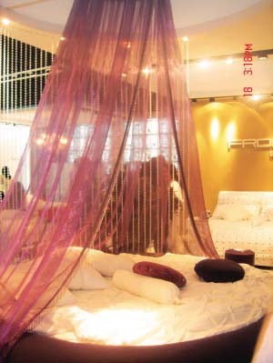 浪漫,只有跟最?lèi)?ài)的人在一起,才能體會(huì ),才是現實(shí)。張麗星家具展廳里最打眼的,當屬這款兩米見(jiàn)方的安吉思情人大圓床:大紅色的床身、高垂而下的紫色幔帳,隨手可觸的黃色海綿抱枕,看到這充滿(mǎn)浪漫情調的盛滿(mǎn)愛(ài)的溫床,你多想像《浪漫櫻花》里一樣,和自己心愛(ài)的人一起,體味這種相濡以沫的浪漫。
