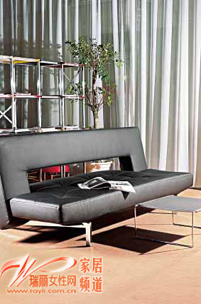 黑色皮質(zhì)面料和寬大體型為此款沙發(fā)床帶來(lái)從容大氣的感覺(jué),銀色鋼架底座和同材質(zhì)的低姿茶幾相映生輝,在床底加裝曲木板條和彈簧,使其保證人體長(cháng)期的躺臥而不變形。